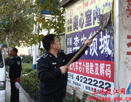 城管人员清理张贴的小广告